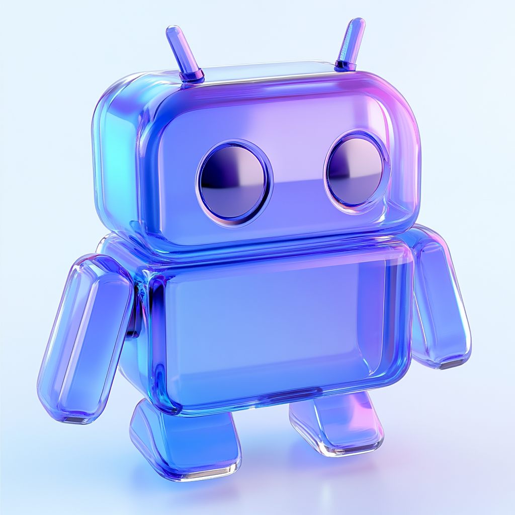Stylized 3D rendering of a robot character featuring a glossy, translucent finish. The vibrant colors and playful design make it suitable for tech-themed projects or children's media.