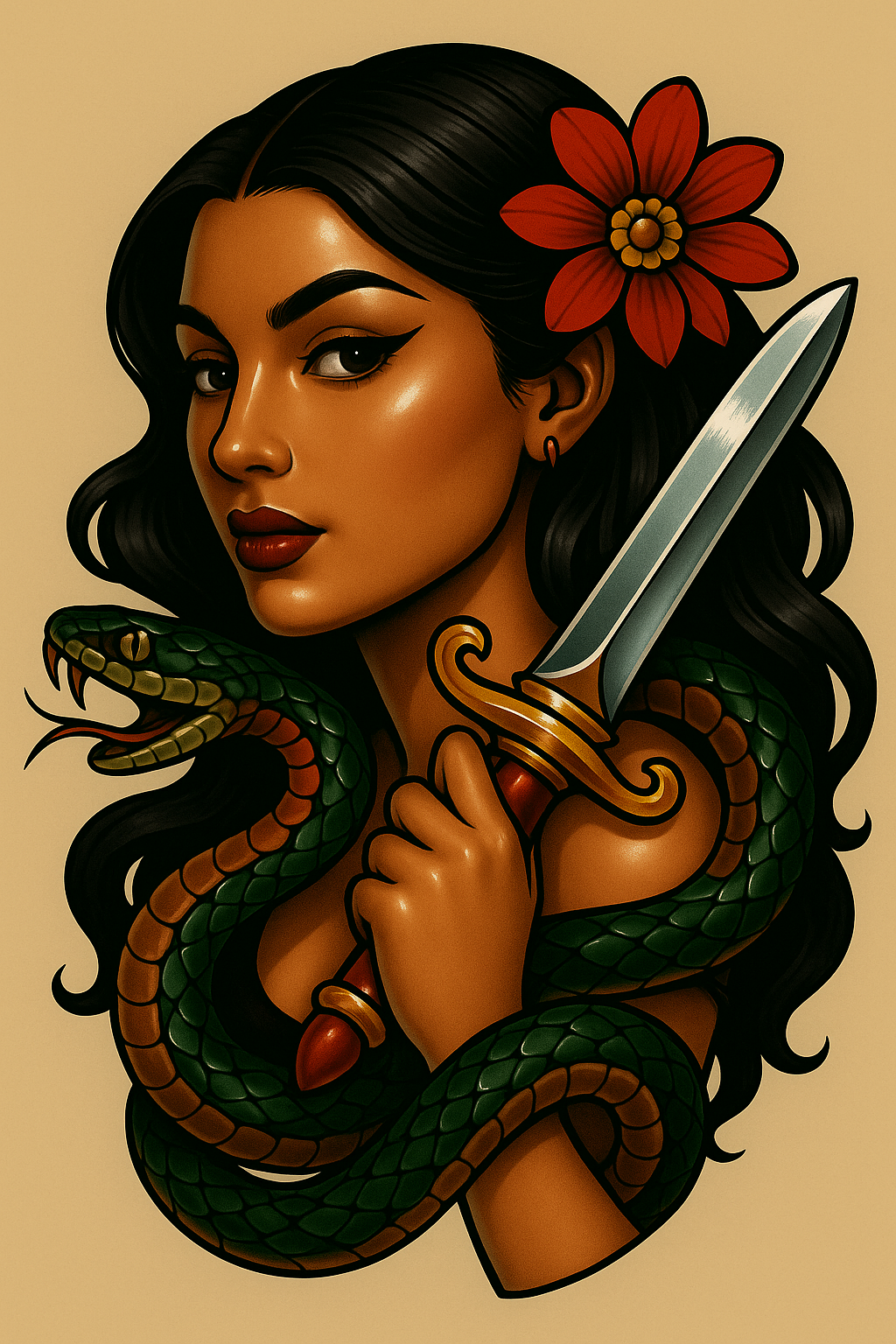 /Collection: /by davooda/Type: PNG/The image features a striking woman holding a dagger with a green snake wrapped around her arm. She has a flower in her hair and a glossy, tattoo-like style with a beige background.