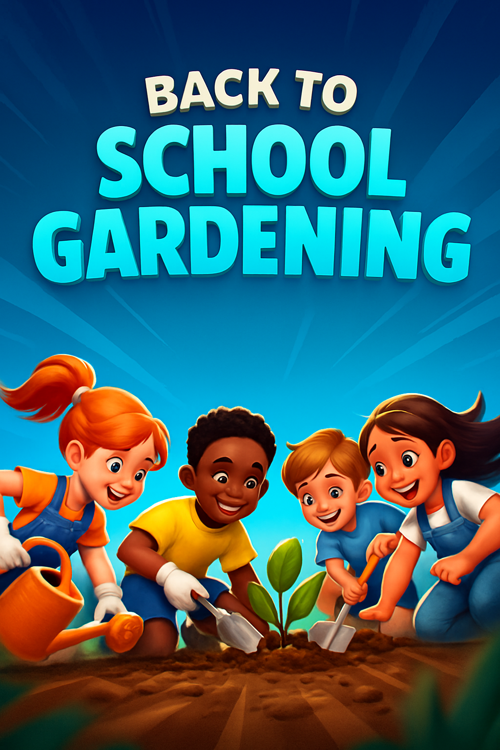 A vibrant illustration depicting children engaged in gardening activities, symbolizing a back-to-school theme. The scene features dynamic angles and colors, with kids using tools and planting.
