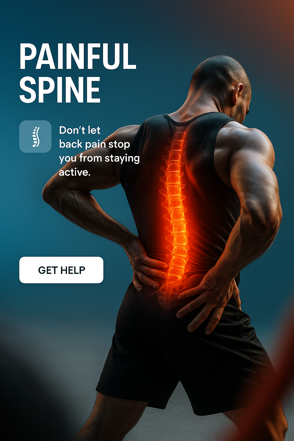 /Collection: /by davooda/Type: PNG/This graphic is a social media post highlighting back pain management. It features a strong visual contrast with a male figure and a glowing spine, aimed at encouraging an active lifestyle despite pain.