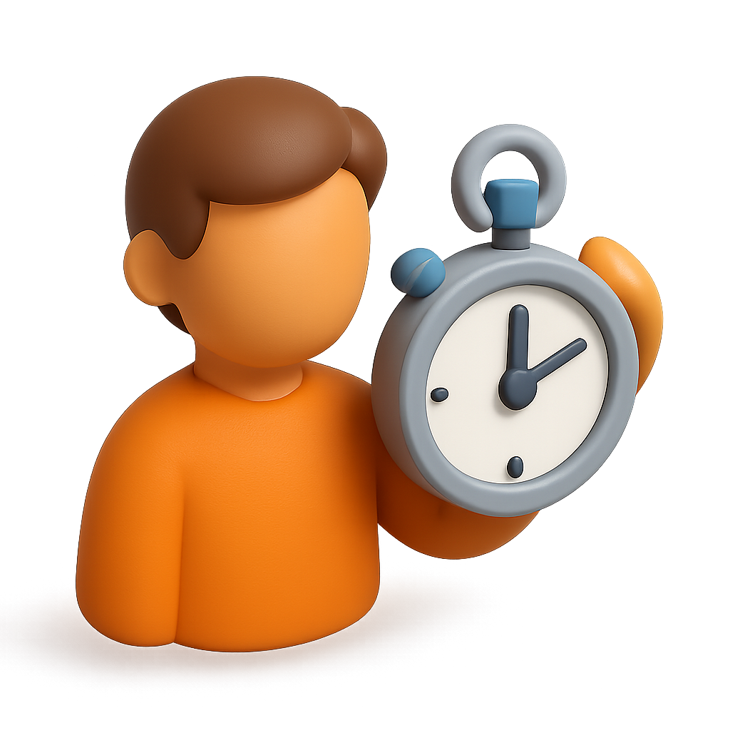 A stylized 3D icon depicting a person holding a stopwatch. The design features a vibrant orange figure and a blue stopwatch with clear clock details, set against a soft gradient background.