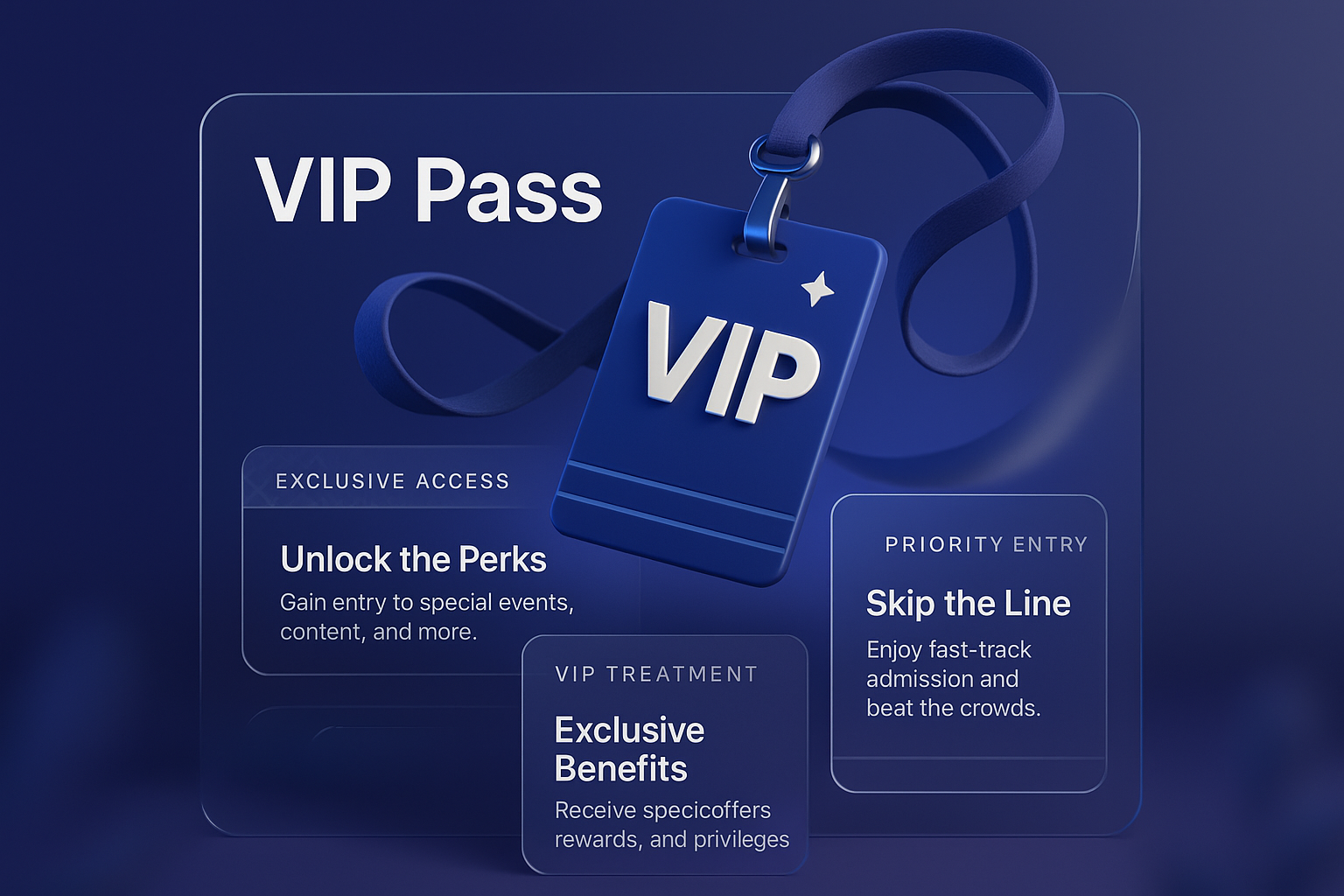 /Collection: /by davooda/Type: PNG/A visually engaging 3D VIP pass featuring a smooth gradient background and dynamic elements. The design includes sections for exclusive access, benefits, and priority entry, enhancing user interaction.