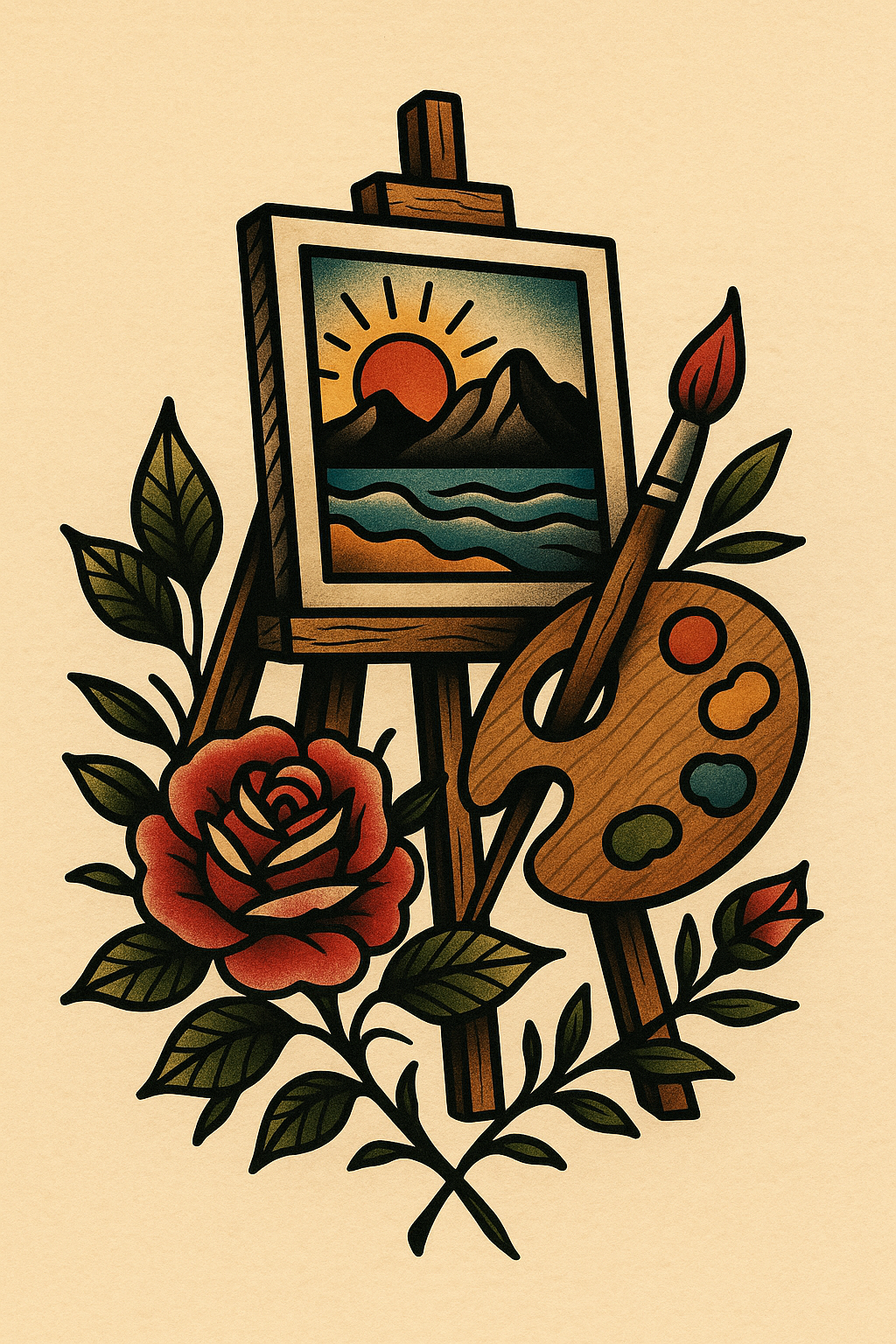 /Collection: /by davooda/Type: PNG/This image features a vibrant illustration of an easel displaying a landscape painting, accompanied by a painter's palette and a rose. The design is colorful and artistic, suitable for creative projects.