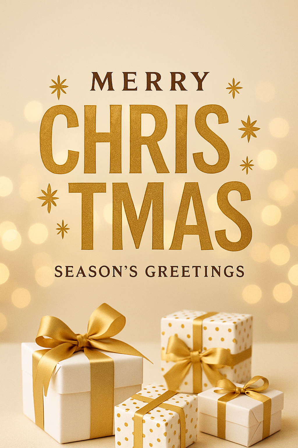 Charming holiday greeting card featuring elegant typography and decorative gift boxes, ideal for seasonal promotions or festive communications.