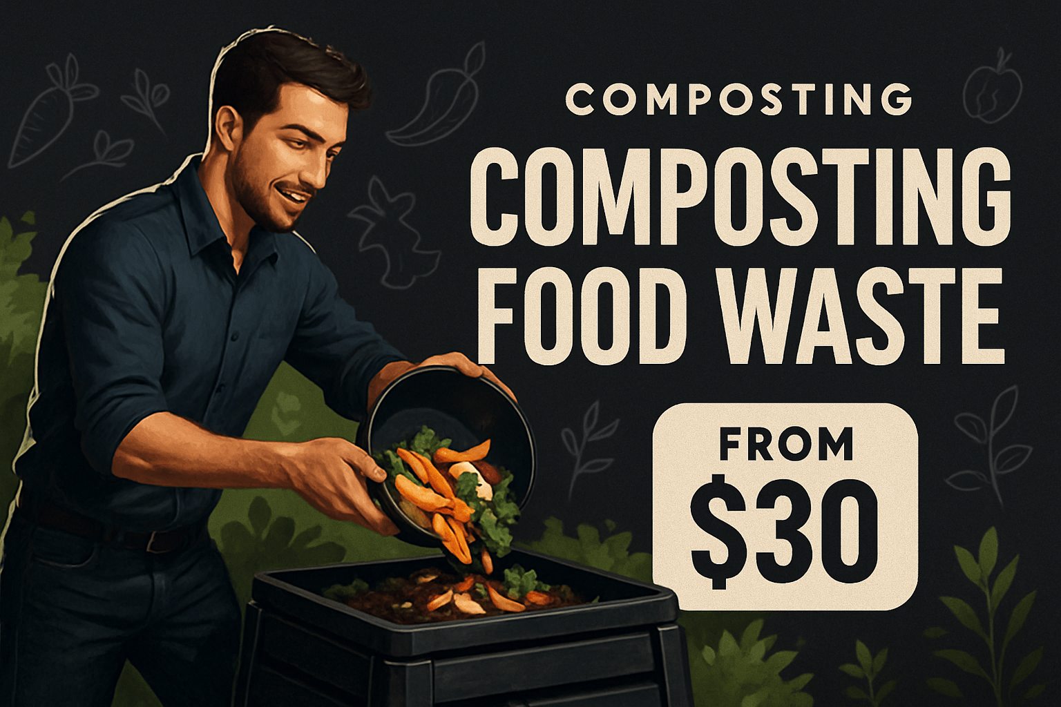 /Collection: /by davooda/Type: PNG/A dynamic advertisement showcasing a person composting food waste in a stylish backyard. The design features bold typography and a textured background, emphasizing eco-friendliness.