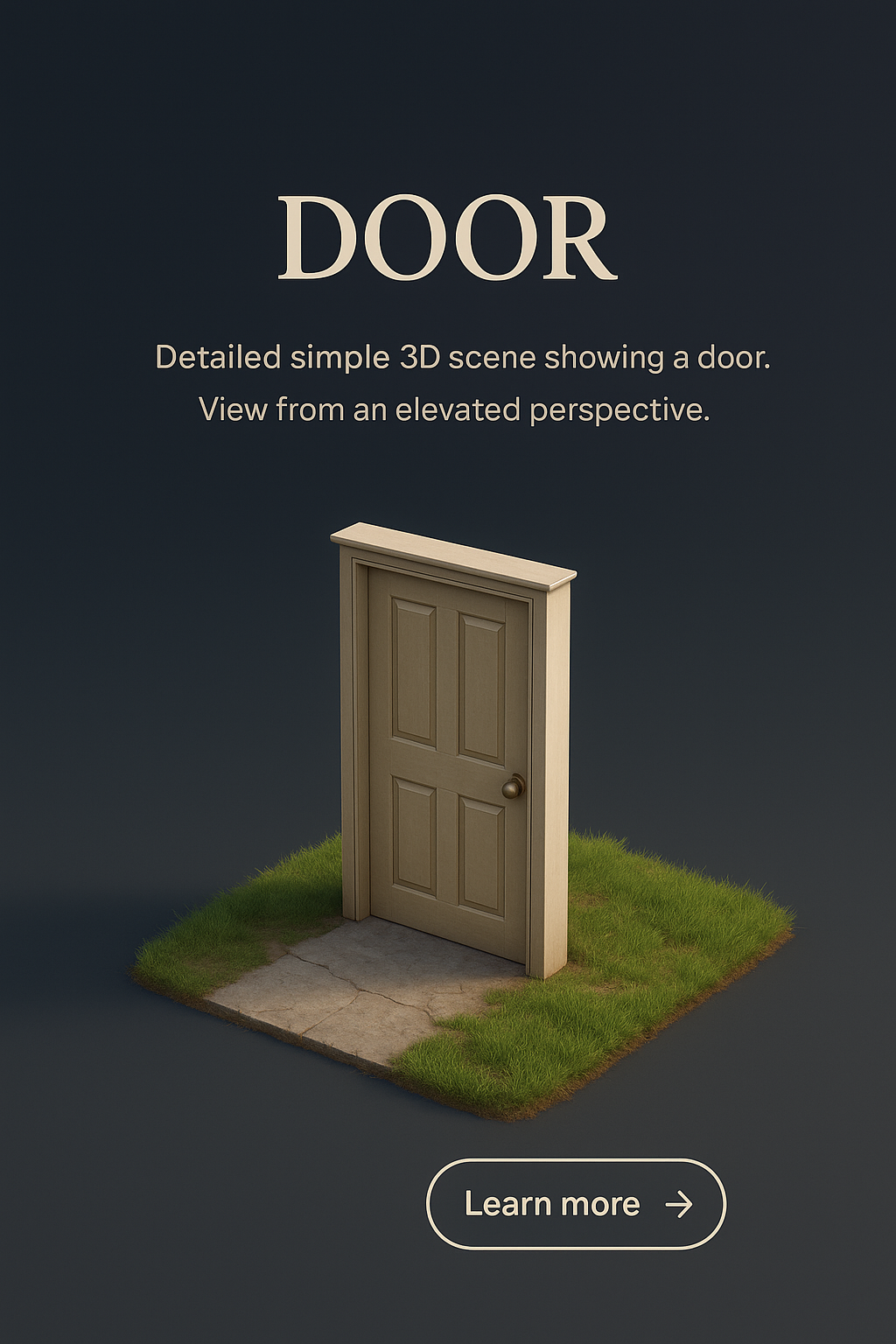 A detailed 3D illustration of a door viewed from an elevated angle, set on a grassy patch with a pathway. The dark gradient background enhances the realism of the scene.