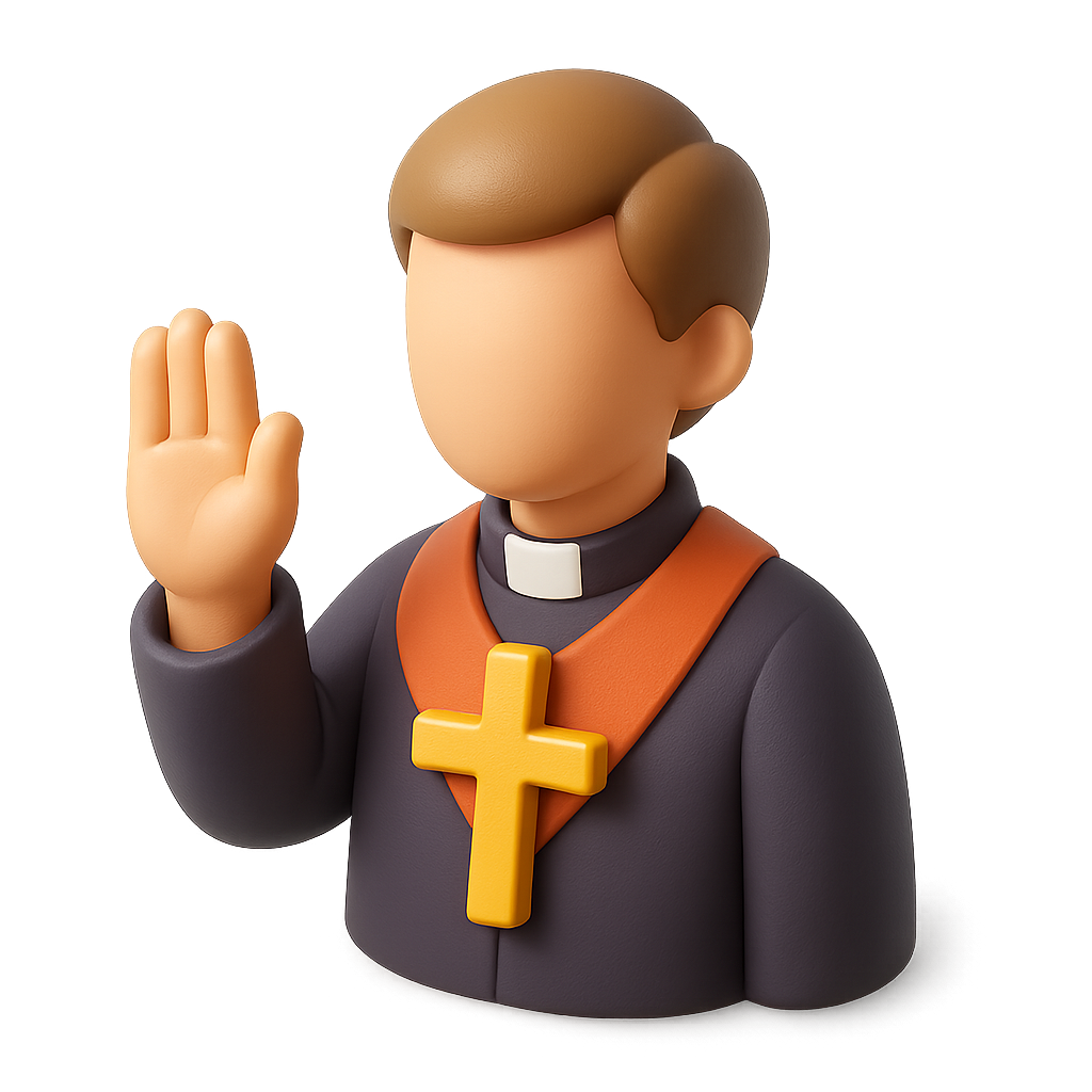 A 3D icon depicting a priest figure with a raised hand and a cross pendant, designed in a volumetric and isometric style, featuring a transparent background.