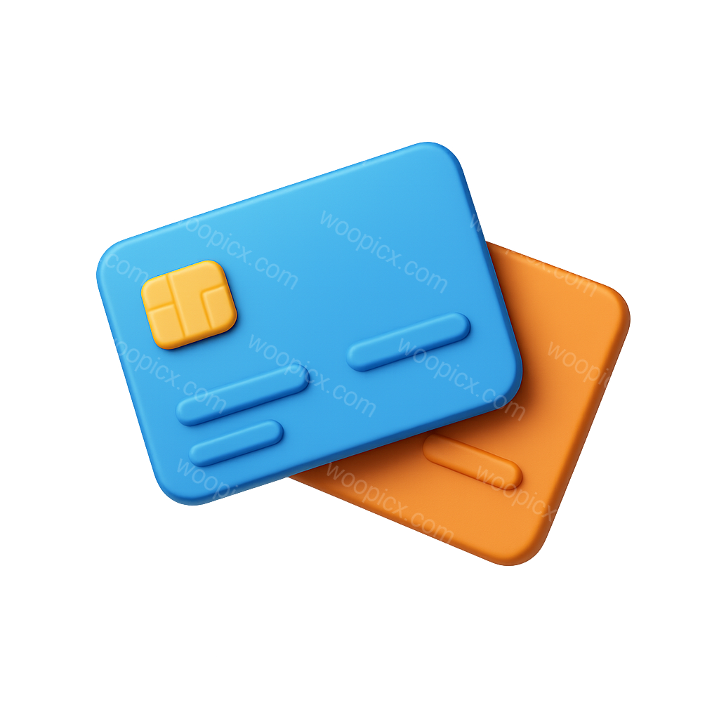 Two colorful 3D credit card icons in blue and orange, designed with a modern isometric style. The cards are shown in a three-quarter view against a subtle gradient background.
