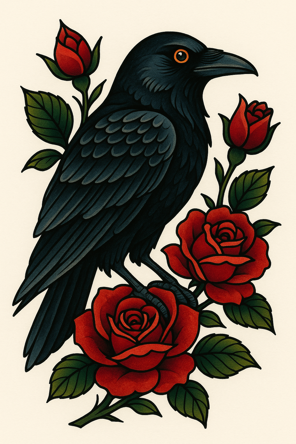 A beautifully illustrated tattoo design featuring a black raven perched among vibrant red roses, showcasing traditional tattoo art style. Perfect for tattoo enthusiasts or nature lovers.