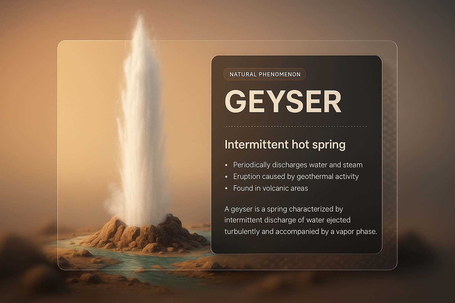 A stunning 3D illustration of a geyser erupting, surrounded by a gradient background. An overlay provides detailed information about geysers in a sleek, dark panel.