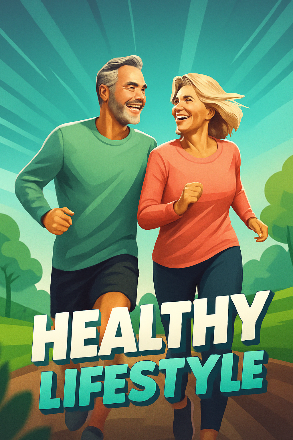/Collection: /by davooda/Type: PNG/A vibrant illustration of a middle-aged couple joyfully running together in a park, embodying a healthy lifestyle. The dynamic background features rays of light and lush greenery, emphasizing their vitality.