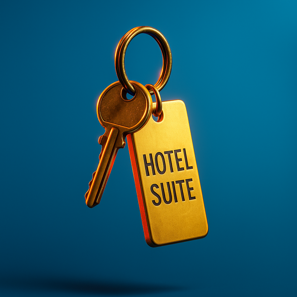 A detailed image of a hotel suite key, prominently displayed against a vibrant blue background. The key shines with a golden hue, showcasing its realistic design and clear text.