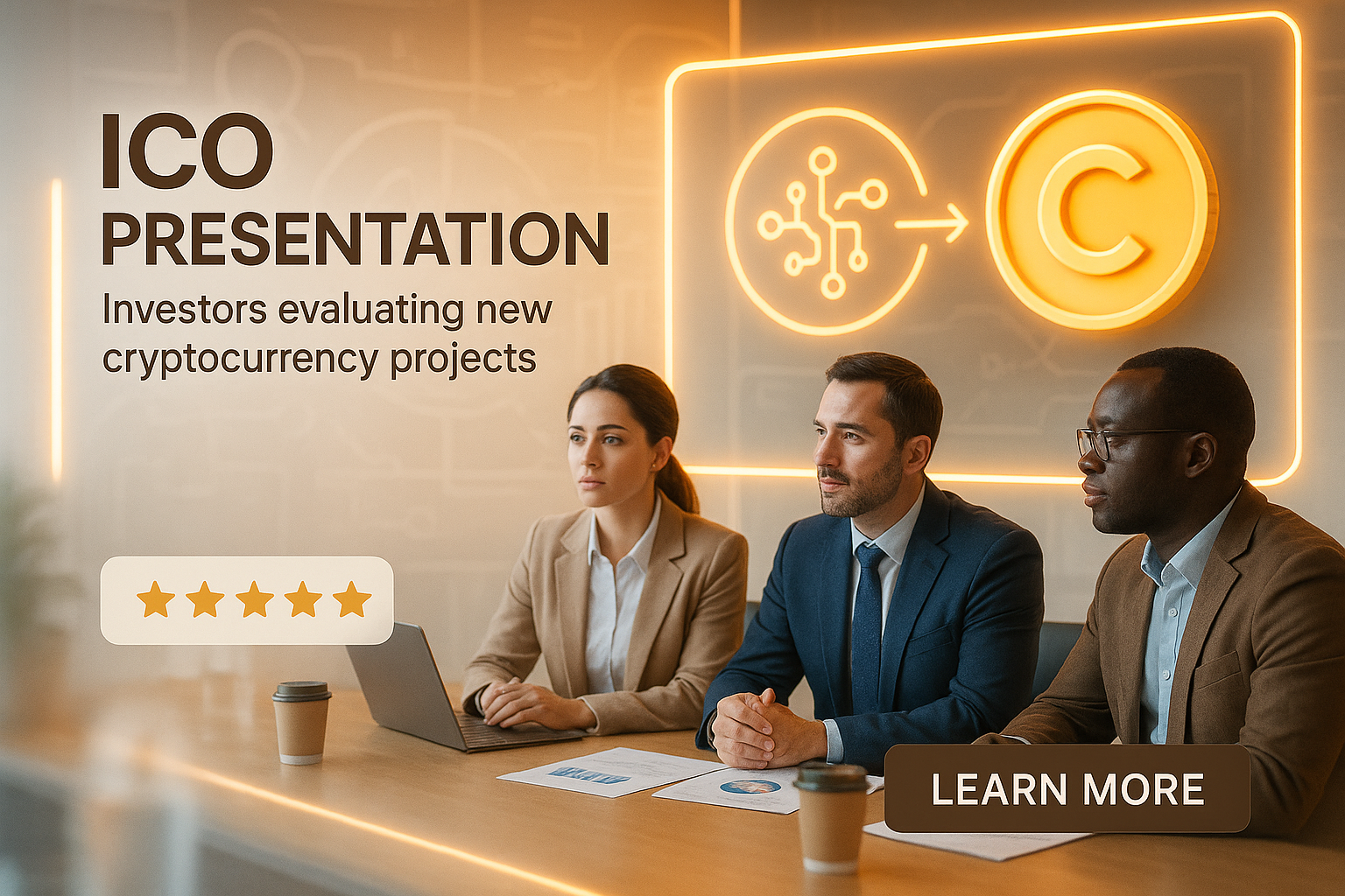 /Collection: /by davooda/Type: PNG/A corporate setting showcasing an ICO presentation, featuring three investors discussing cryptocurrency projects. The design combines modern digital elements and a warm ambiance, ideal for finance and tech marketing.