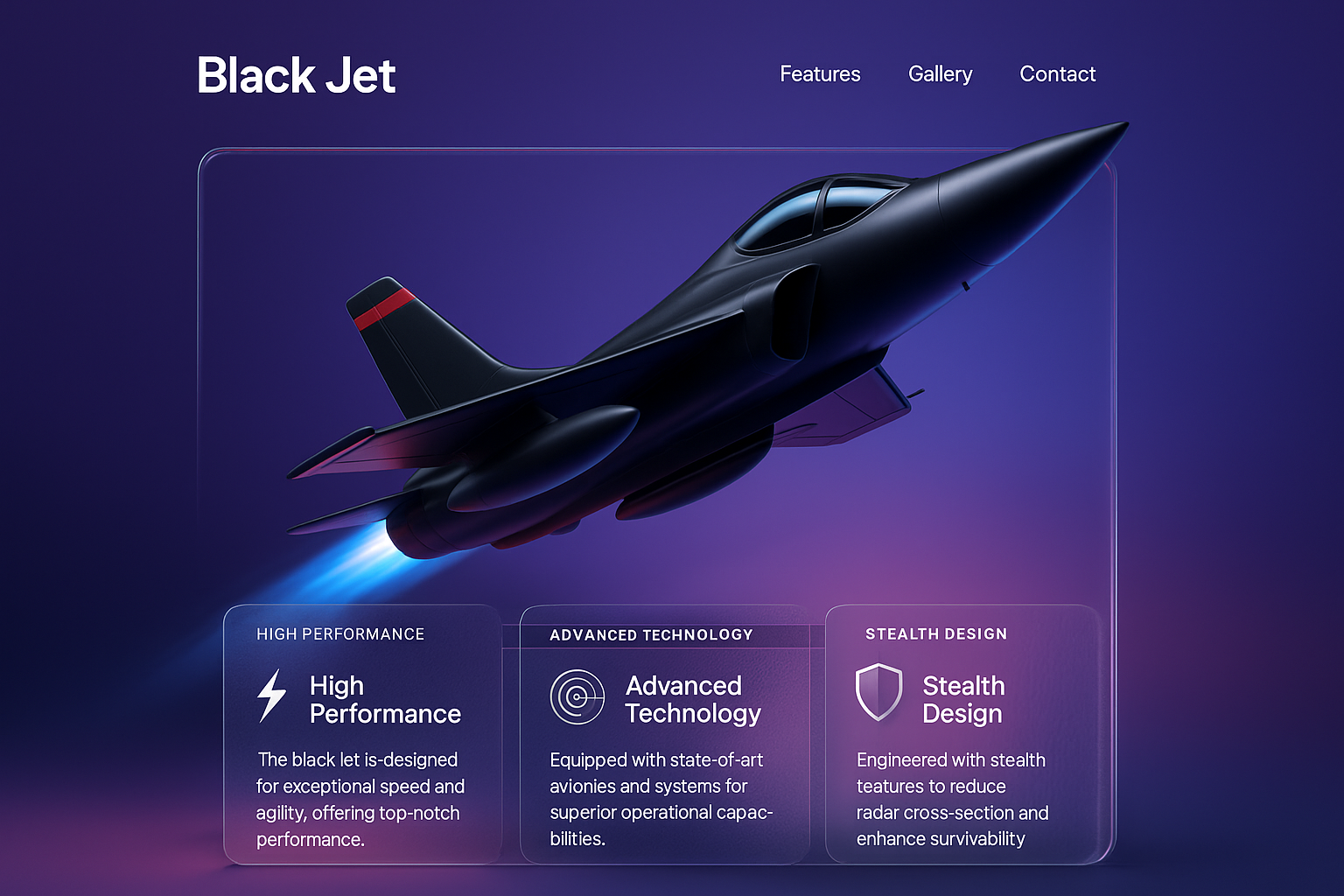 A stunning 3D illustration of a black jet, showcasing advanced technology and stealth design. The layout includes feature blocks with a sleek background and modern aesthetics.