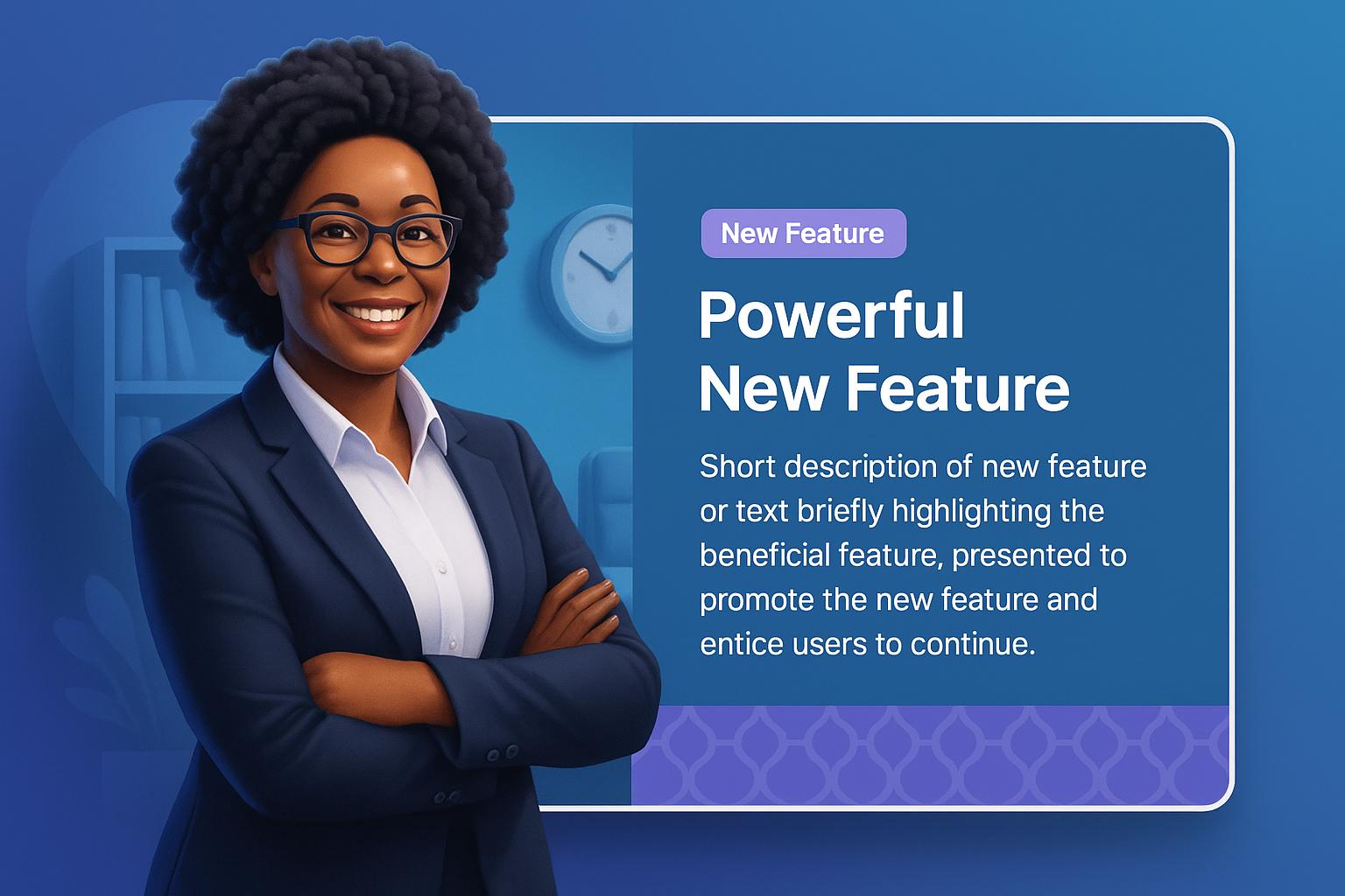 /Collection: /by davooda/Type: PNG/A smiling middle-aged businesswoman with glasses stands confidently in her office, arms crossed. The background features a soft gradient with a hint of a clock and furniture, emphasizing a professional atmosphere.