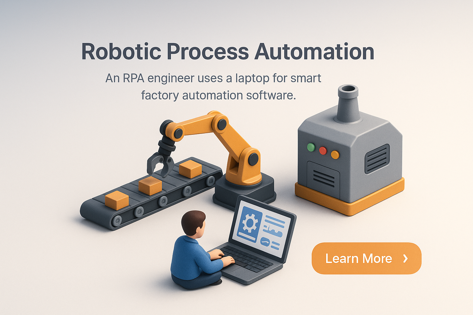 /Collection: /by davooda/Type: PNG/A detailed 3D scene depicting a robotic process automation engineer using a laptop in a smart factory setting. Small elements illustrate the automation process.