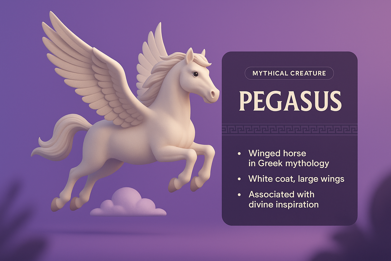A beautifully crafted 3D illustration of Pegasus, a winged horse from Greek mythology, set against a smooth gradient background. The design includes an informative panel highlighting key characteristics.