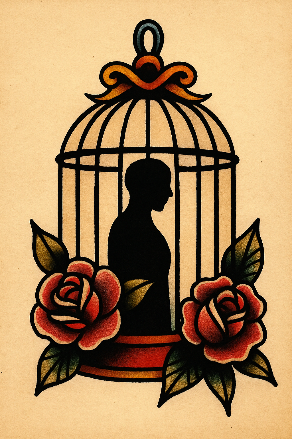 Silhouette of a Key Holder in a Birdcage Tattoo Design