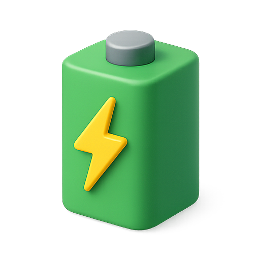 A modern, stylized battery icon featuring a green body and a prominent yellow lightning bolt. Ideal for tech-related applications or energy themes.