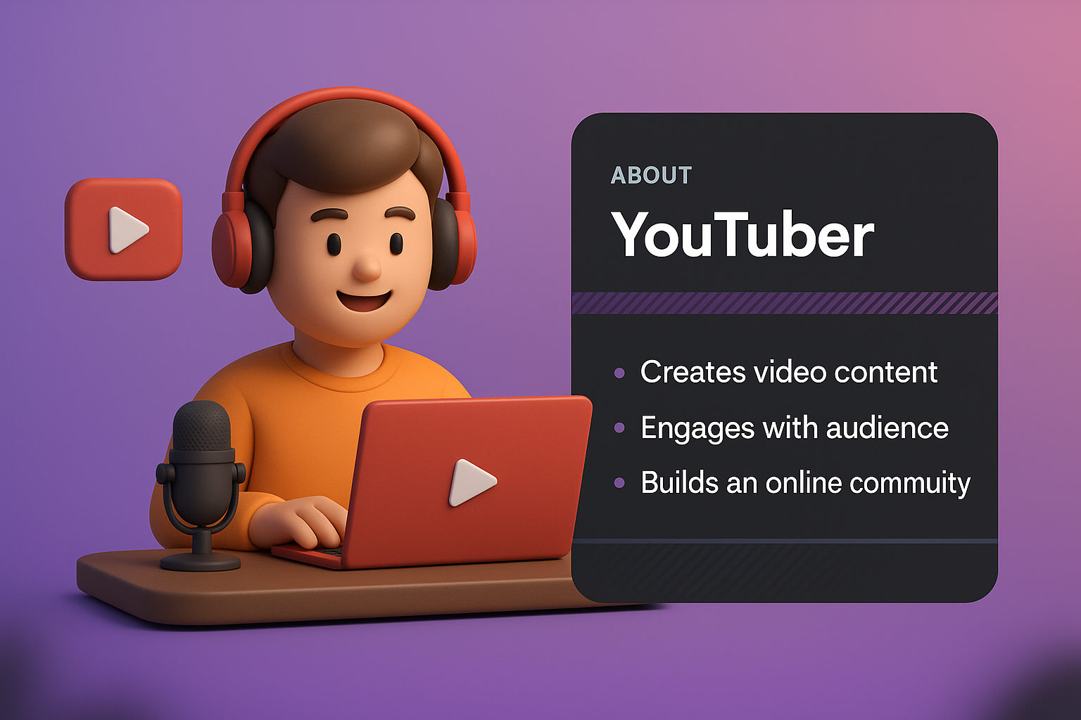 A vibrant 3D illustration featuring a YouTuber at a desk with a laptop, microphone, and headphones. The design includes a dark overlay with text about content creation.
