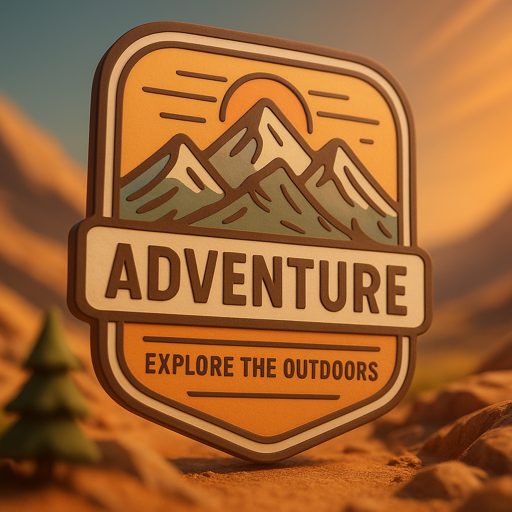 Outdoor Adventure Badge Design Featuring Mountains and Sun