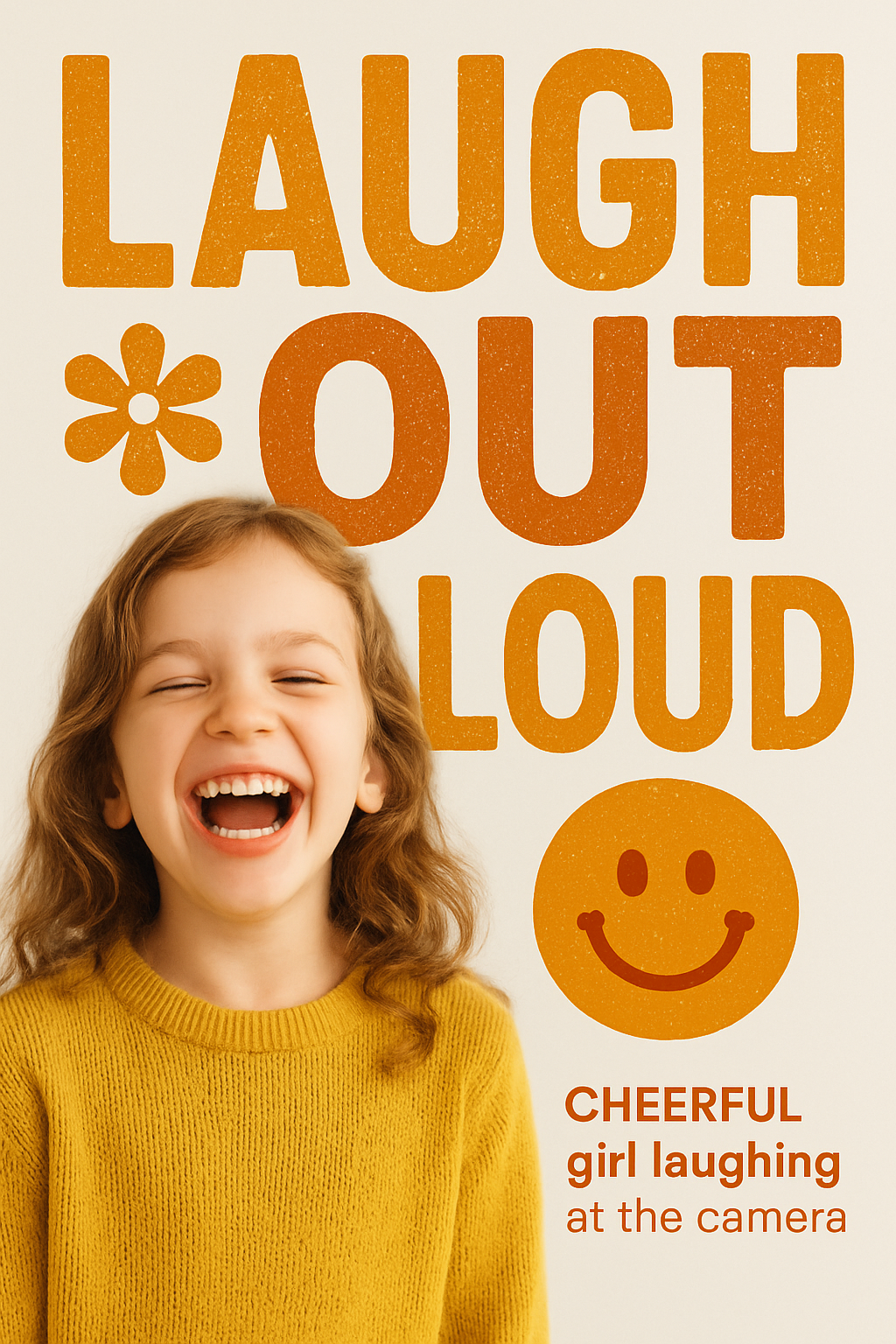 Vibrant and cheerful image of a girl laughing, featuring bold, playful typography. Ideal for social media posts or children's content.