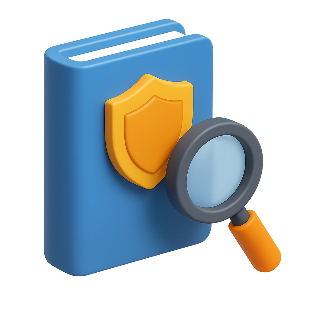 A visually striking 3D icon depicting a blue book with a shield and magnifying glass, symbolizing threat intelligence. The design features a transparent background and an isometric perspective.