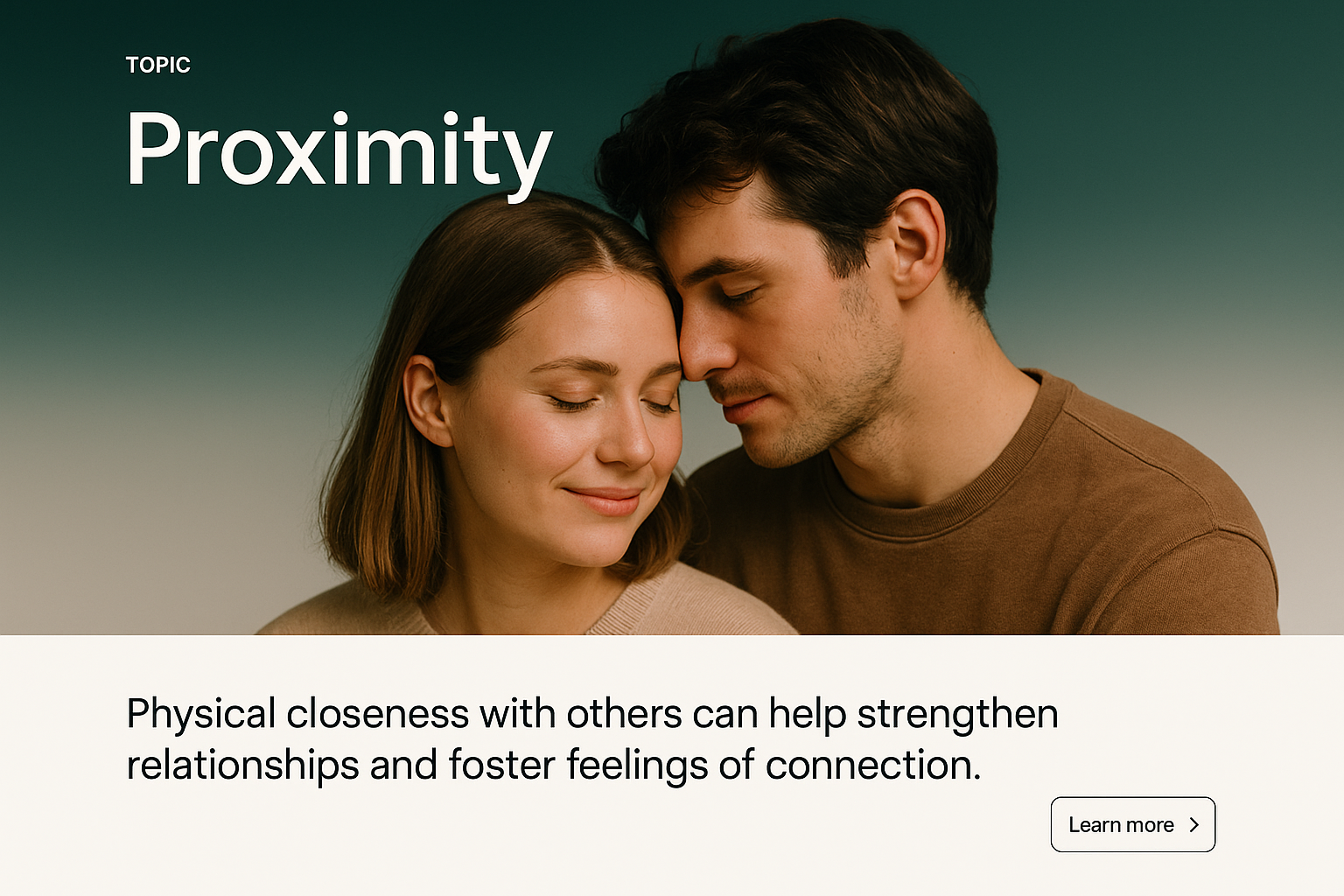 A minimalist web page layout featuring a gradient background with a couple expressing proximity. Includes a brief text block and a call-to-action button.