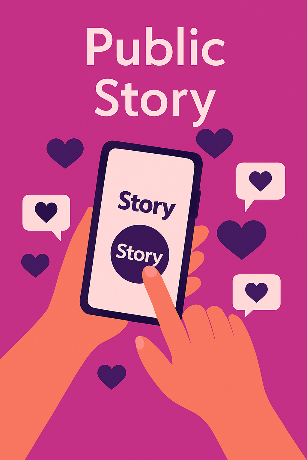 /Collection: /by Sergey Leonov/Type: PNG/Illustrative graphic depicting a hand interacting with a smartphone displaying a public story feature, ideal for social media marketing or app promotion.