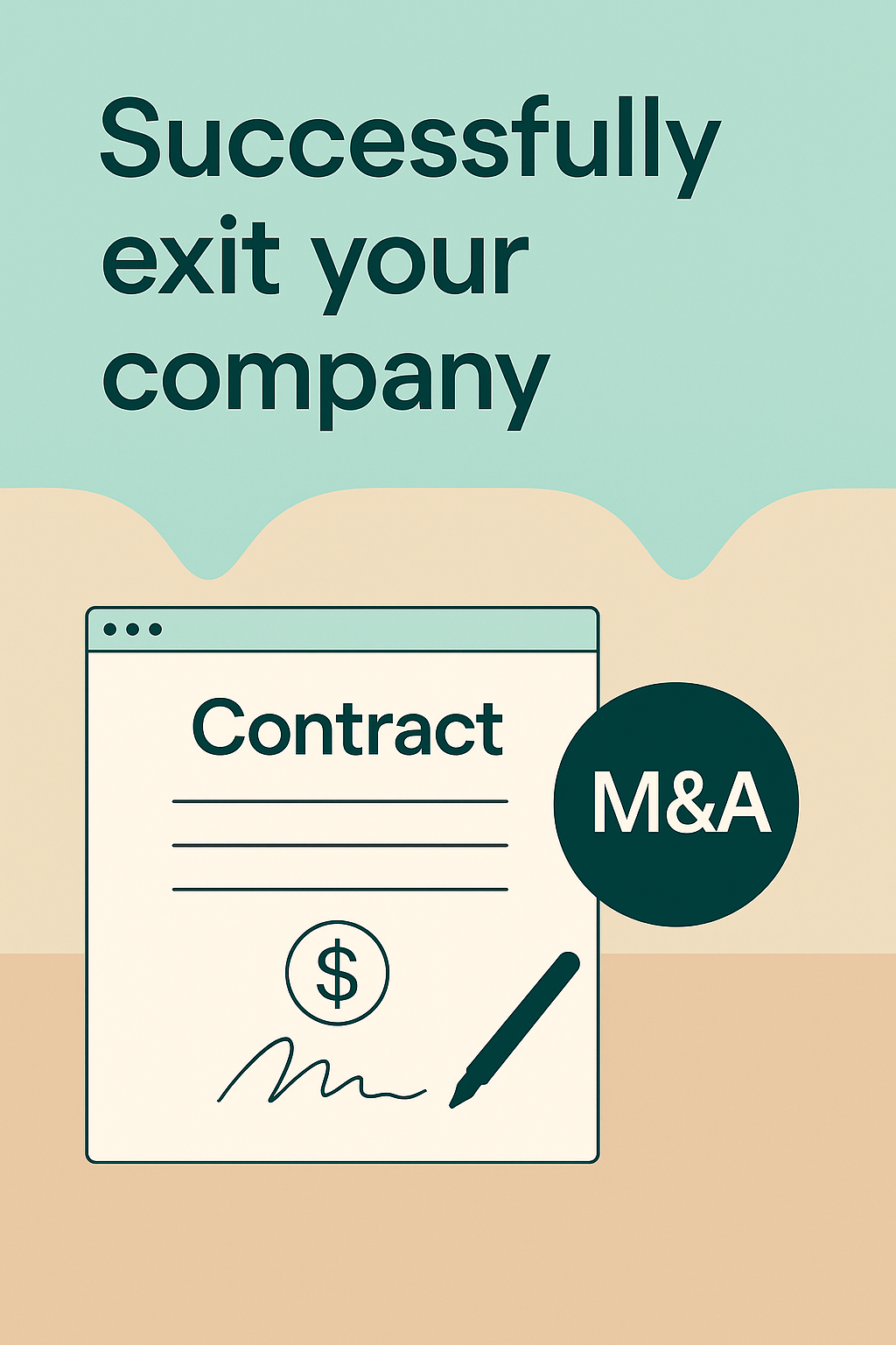 A visually engaging graphic illustrating the concept of successfully exiting a company through M&A, featuring a contract illustration. Ideal for business consulting or finance-related content.