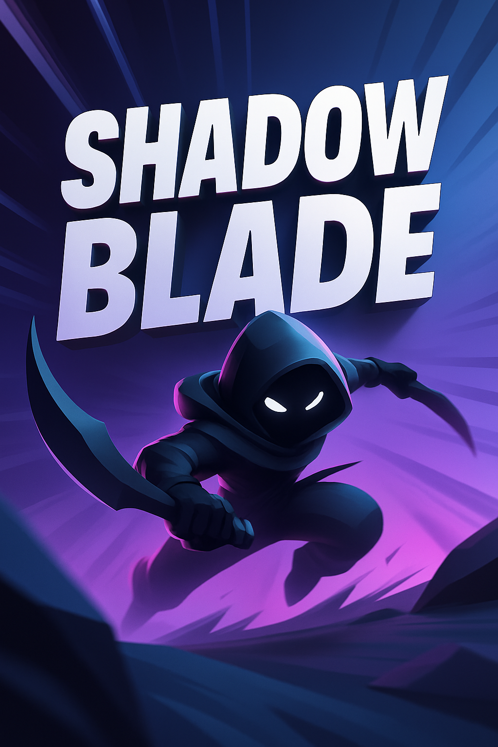 A dynamic illustration featuring a hooded figure wielding a blade, set against a gradient background. The title 'SHADOW BLADE' is prominently displayed in a bold, engaging font.
