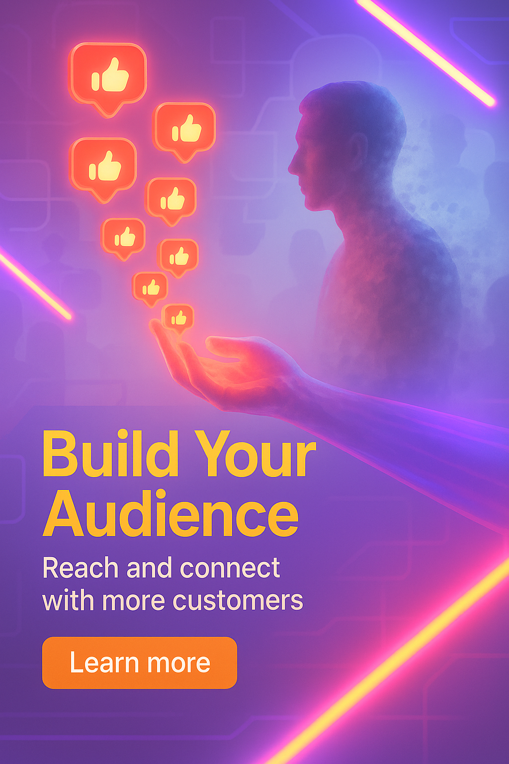 Vibrant digital marketing graphic showcasing a hand reaching out with social media likes, ideal for promoting audience engagement strategies.