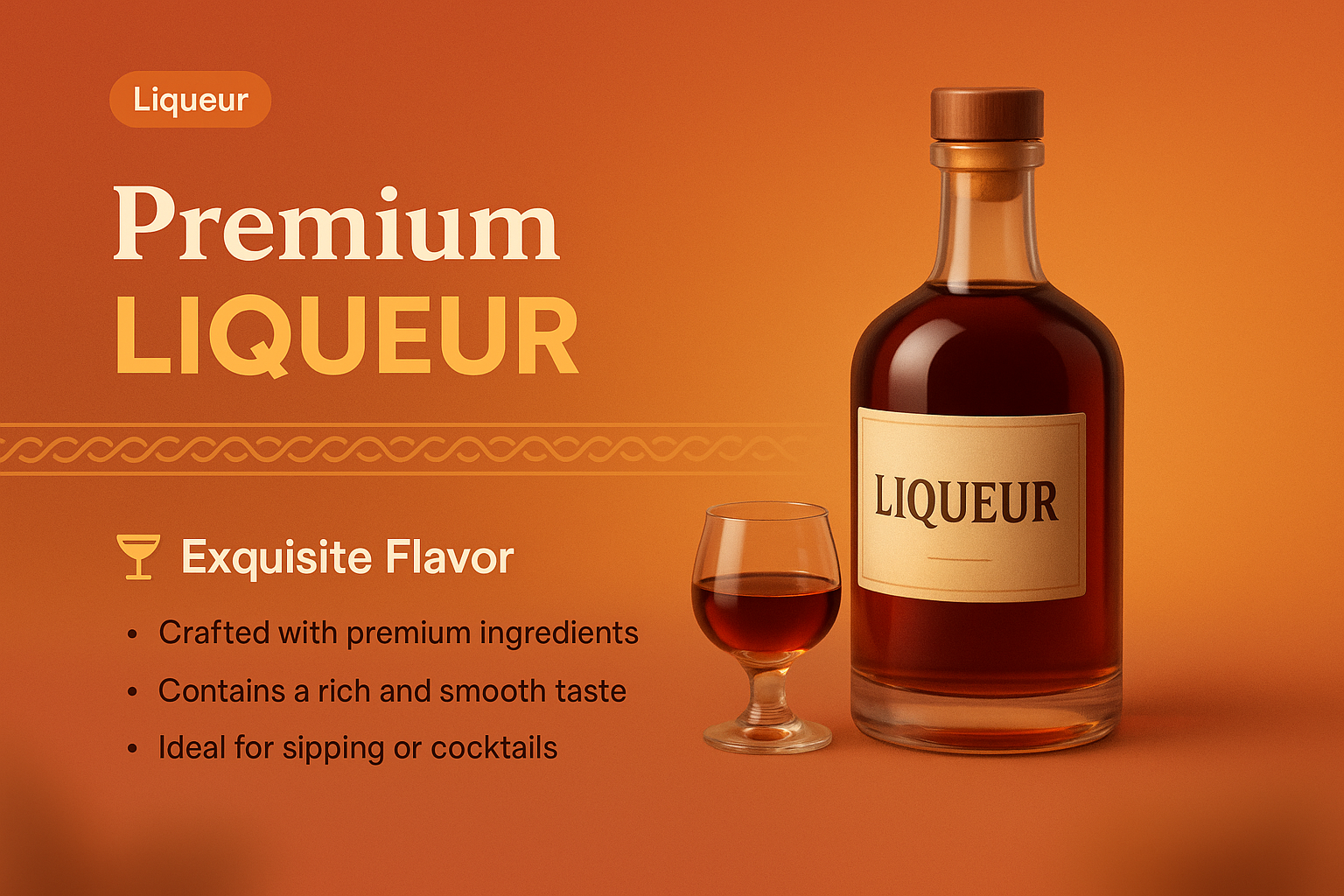 /Collection: /by davooda/Type: PNG/A visually appealing landing page for premium liqueur featuring a 3D bottle and glass. The design includes a gradient background, clear headings, and bullet points highlighting key features.
