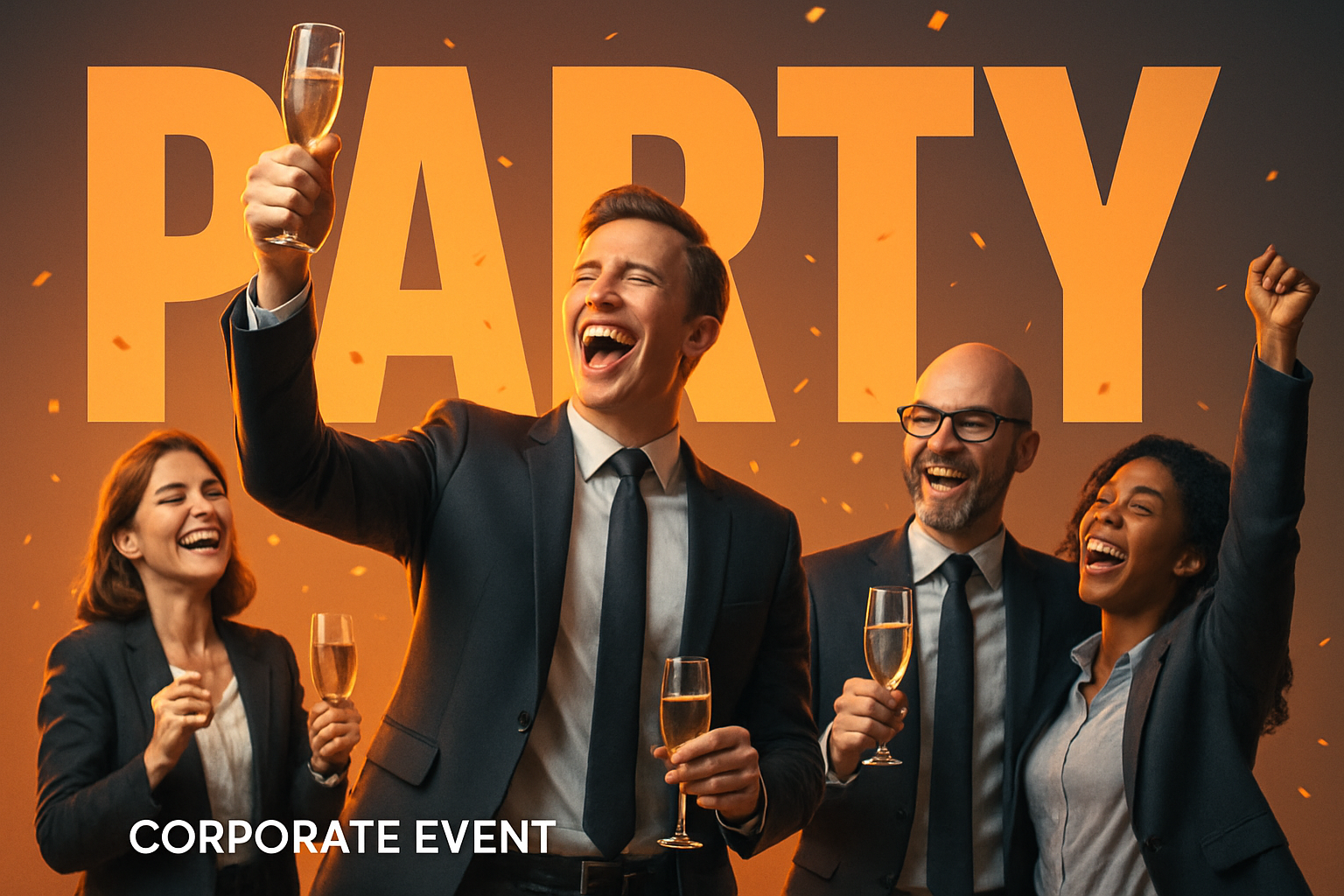 /Collection: /by davooda/Type: PNG/A vibrant corporate party scene featuring businesspeople celebrating with champagne. The bold 'PARTY' headline dominates the background, creating a festive atmosphere.