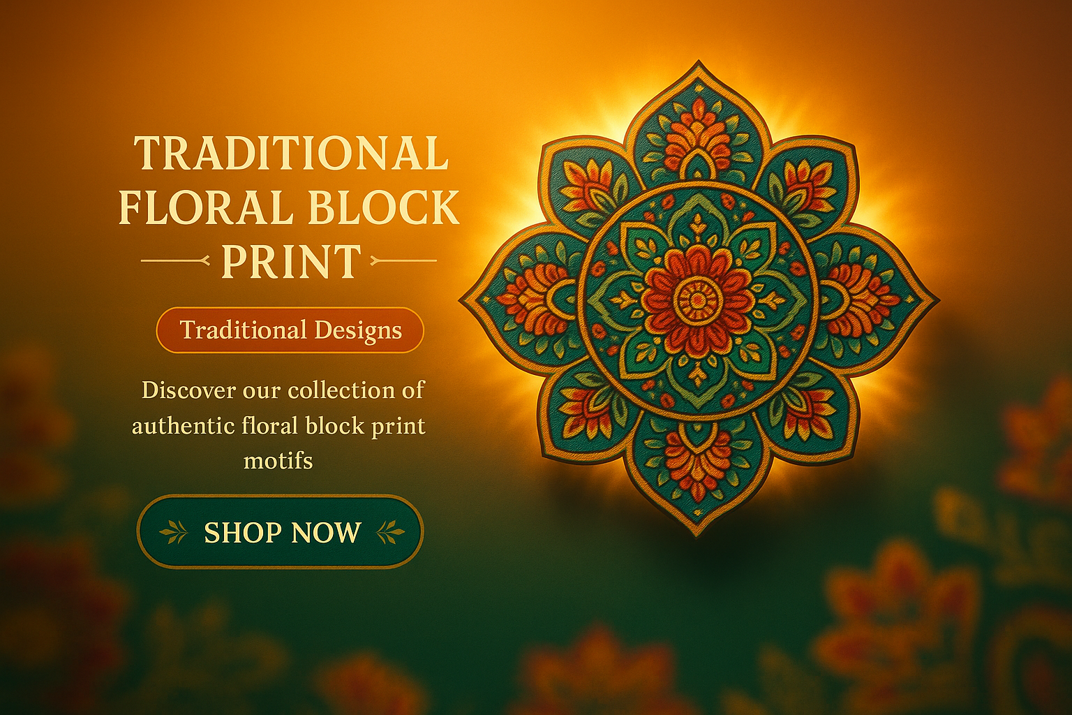 /Collection: /by davooda/Type: PNG/This image is a promotional banner featuring a colorful floral block print design. It targets customers interested in traditional art, inviting them to explore authentic motifs.