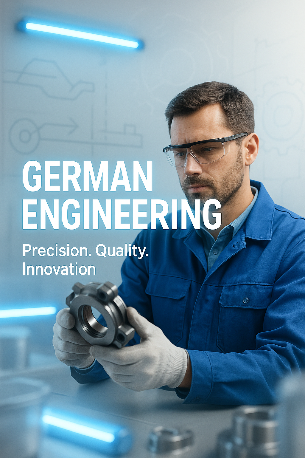 /Collection: /by davooda/Type: PNG/A professional engineer in a blue lab coat examines a precision component, showcasing themes of quality and innovation in engineering. The modern design and blue lighting create a high-tech atmosphere ideal for industry-related marketing.
