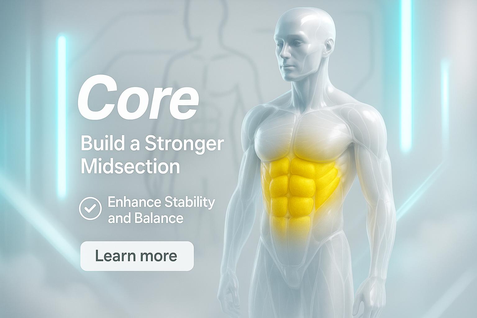 A modern fitness promotional graphic showcasing a human figure with highlighted midsection muscles, designed to promote core strength and stability. Ideal for health and wellness marketing.