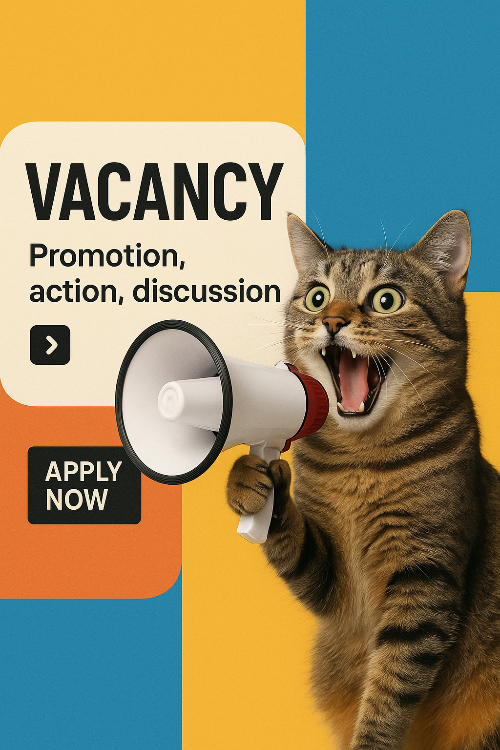 A lively cat holding a megaphone against a geometric backdrop, promoting a vacancy. The design features bold typography and a balanced layout, emphasizing clarity and modern aesthetics.