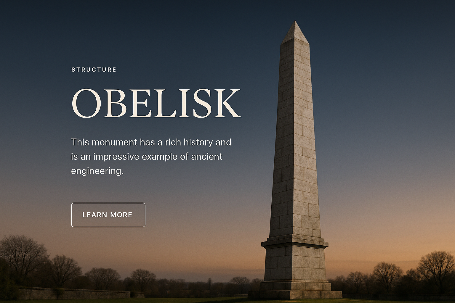 This image showcases a stylish web page design featuring an obelisk against a gradient sky. Text elements include a title and a brief description, complemented by a 'Learn More' button.