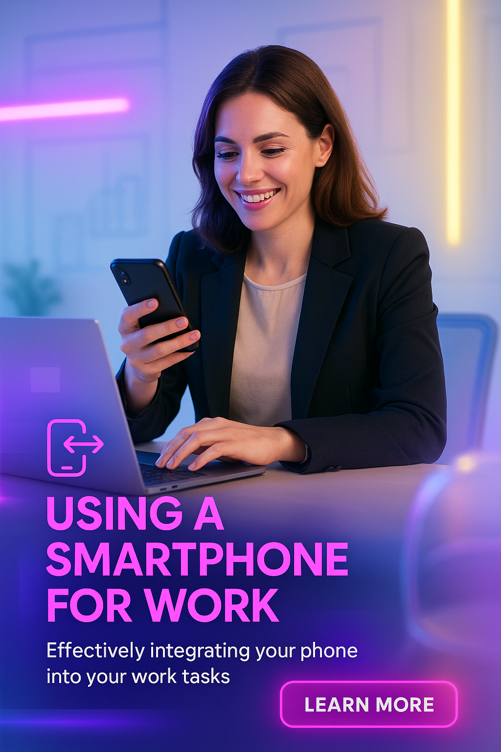 Engaging social media post featuring a woman using a smartphone in a modern office setting, ideal for promoting mobile productivity tools.