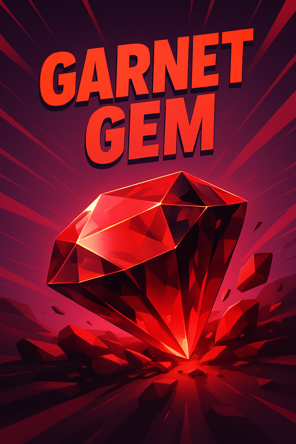 A striking 3D illustration of a garnet gem set against a vibrant gradient background. The design features dynamic rays emanating from the center, enhancing the gem's allure.