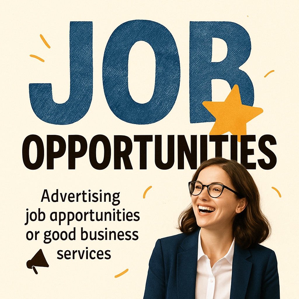 Vibrant social media post promoting job opportunities, featuring bold typography and a cheerful professional, ideal for recruitment campaigns.