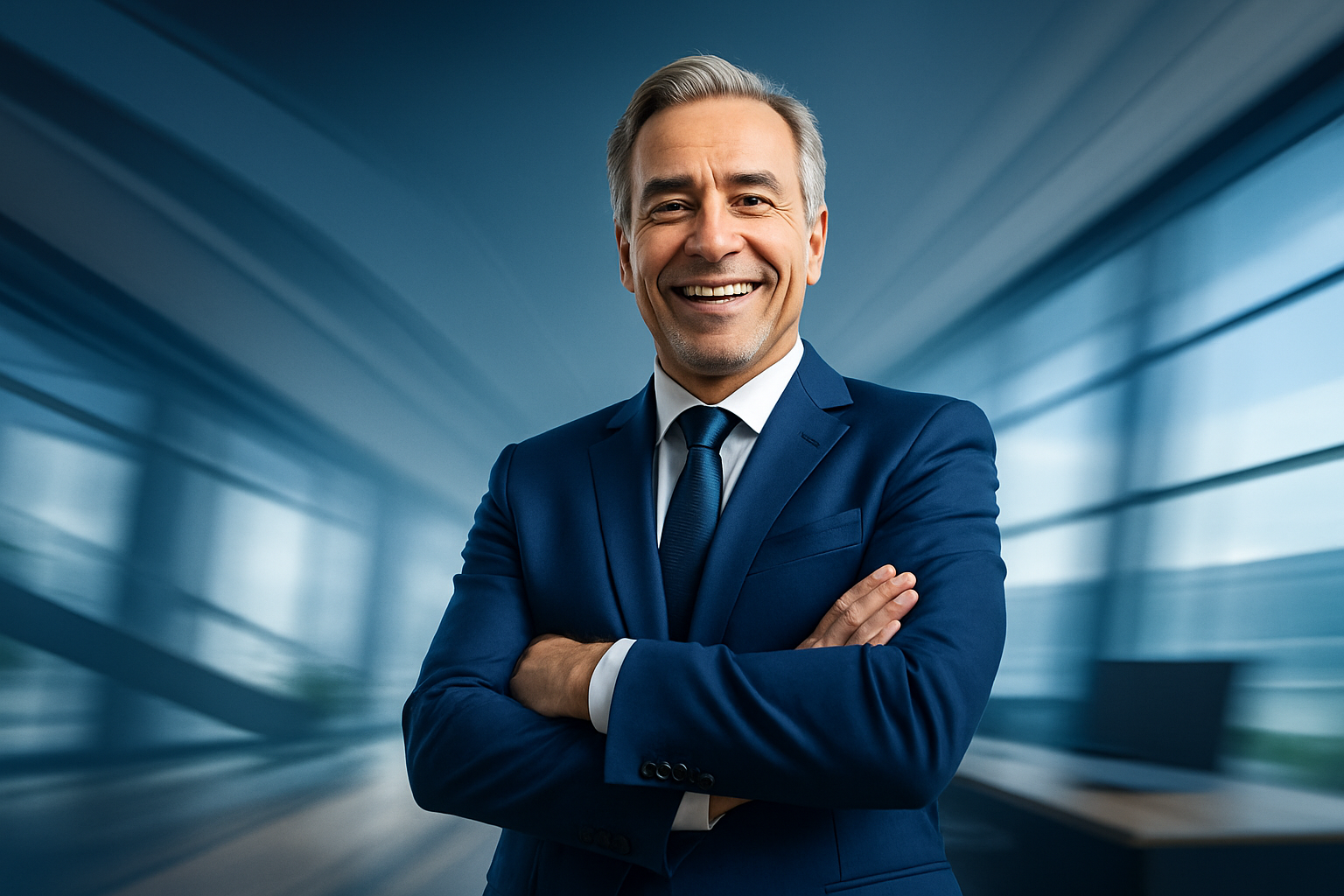 /Collection: /by davooda/Type: PNG/A confident middle-aged businessman in a blue suit stands with arms crossed, smiling in a modern office. The dynamic background features smooth gradients and a sense of motion, enhancing the professional atmosphere.