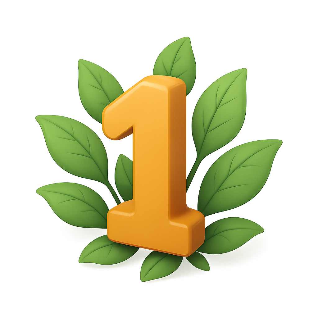 /Collection: /by davooda/Type: PNG/A vibrant 3D icon of the number one in orange, nestled among bright green leaves, creating a lively and organic appearance. The design features a soft gradient background.