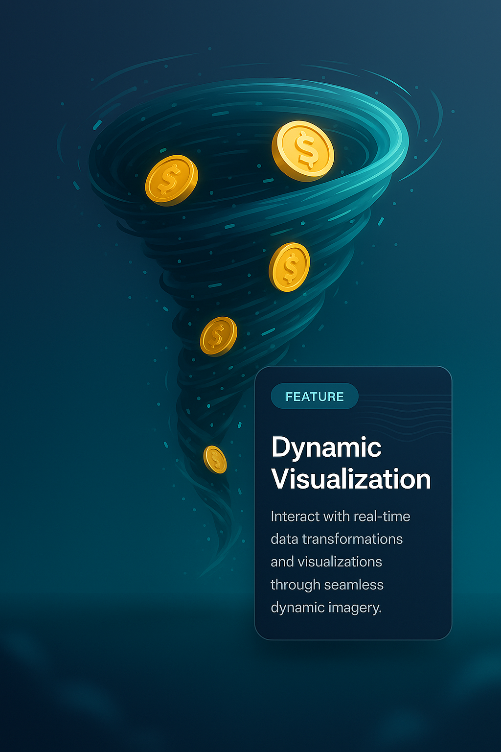 /Collection: /by davooda/Type: PNG/A dynamic 3D illustration depicting a tornado made of data swirling with glowing coins. The composition features a gradient background and a clear visual focus on the tornado.