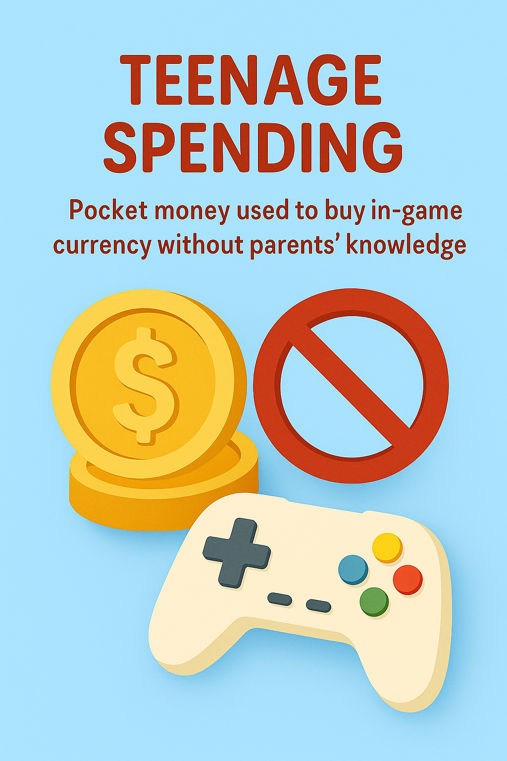Informative infographic illustrating teenage spending on in-game currency, featuring engaging visuals of coins and a game controller, aimed at parents and educators.