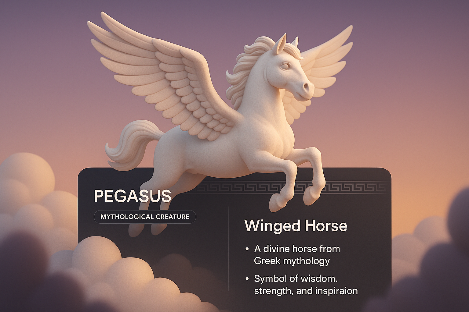 /Collection: /by davooda/Type: PNG/A stunning 3D illustration of Pegasus, the winged horse from Greek mythology, integrated into a web design layout featuring a dark label and descriptive blocks.