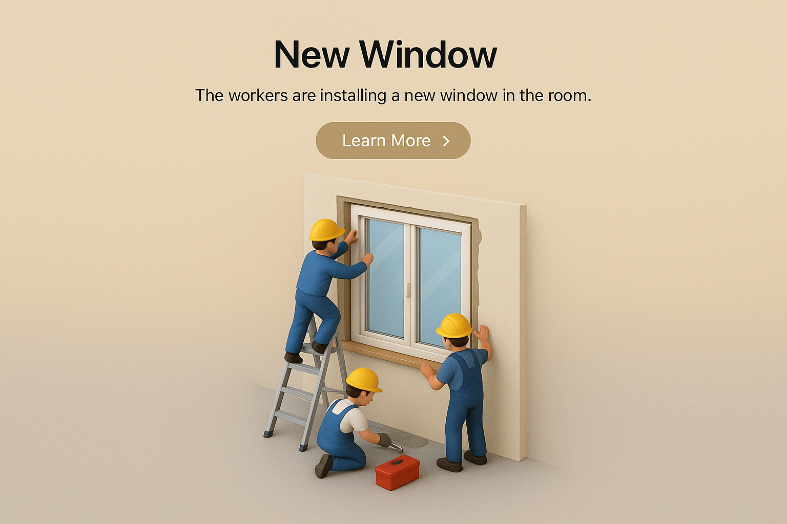 /Collection: /by davooda/Type: PNG/A detailed 3D scene depicting small workers installing a new window. The scene is zoomed out, showcasing a minimalistic background with a gradient transition. Text elements are clearly visible.