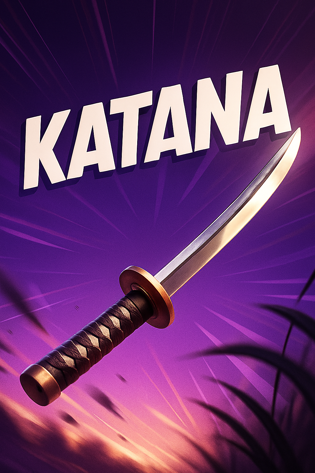 A striking illustration of a katana sword, featuring dynamic lines radiating from the center. The bold title 'KATANA' emphasizes the weapon, set against a smooth gradient background.