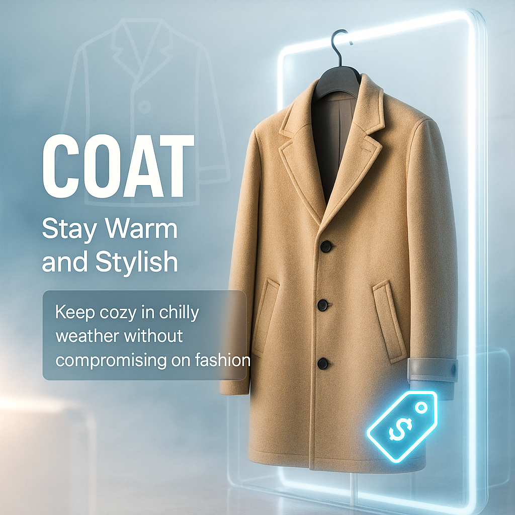 Promotional image featuring a stylish winter coat with a modern visual style, aimed at fashion-conscious consumers looking for warmth and style. Ideal for online retail marketing.
